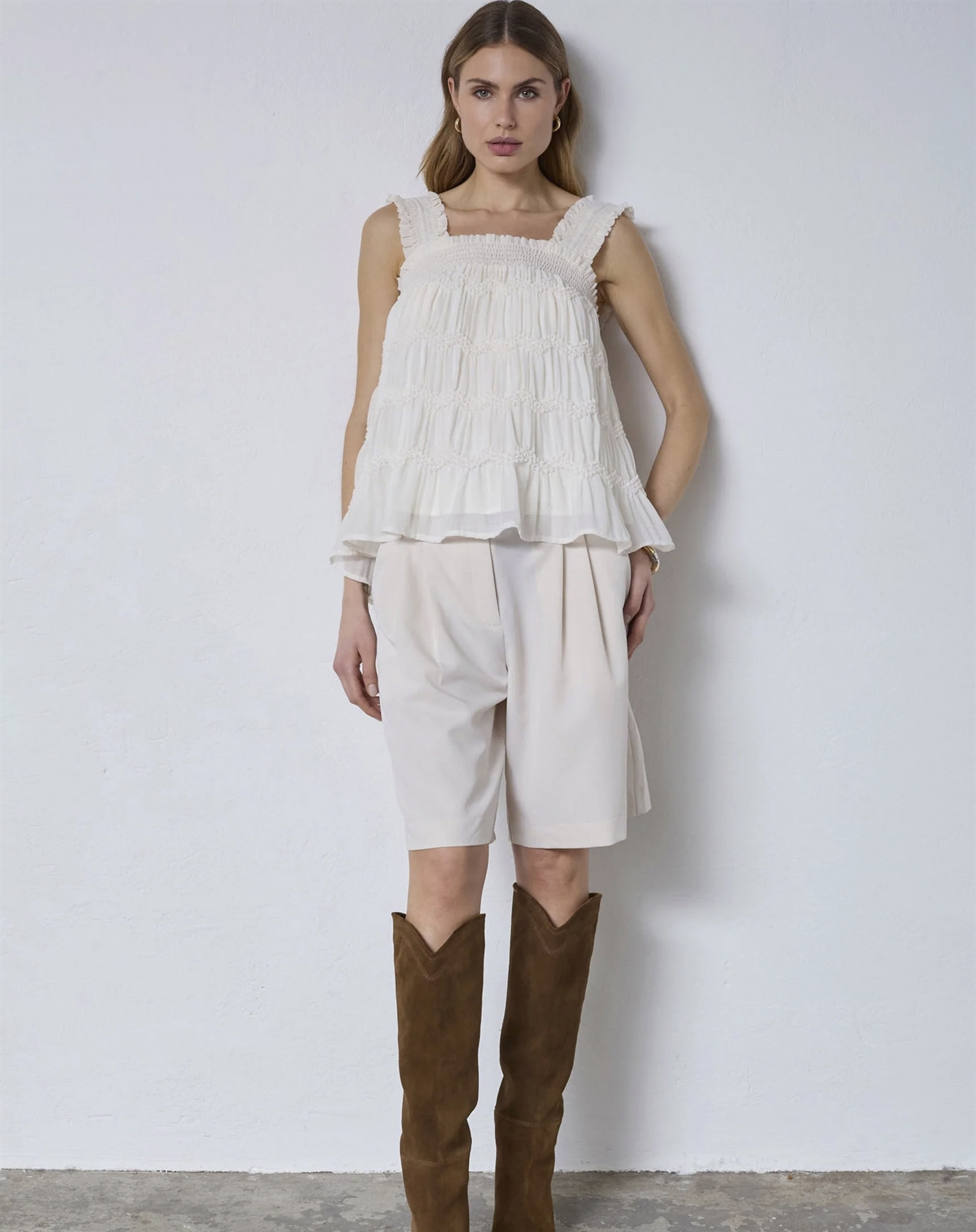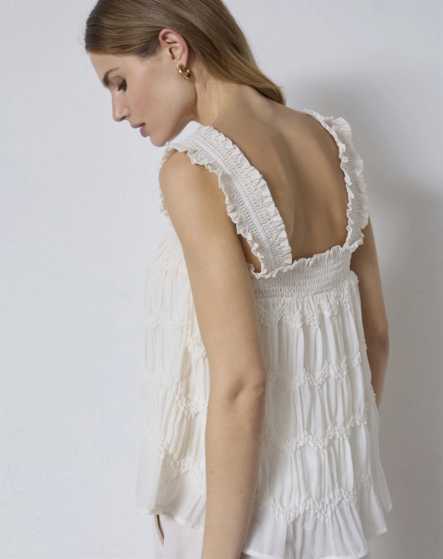 Stell dir einen warmen Sommertag vor, an dem du dieses Top mit einer hoch geschnittenen Jeans und Sneakers für einen lässigen Look kombinierst, oder mit einem Rock und Sandalen für einen raffinierteren Stil. Die Smock-Details sorgen für eine schöne Textur und einen Hauch Extra-Flair, wodurch es sich sowohl für den Alltag als auch für formellere Anlässe eignet.