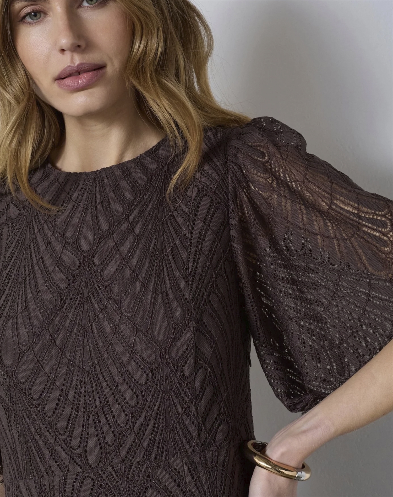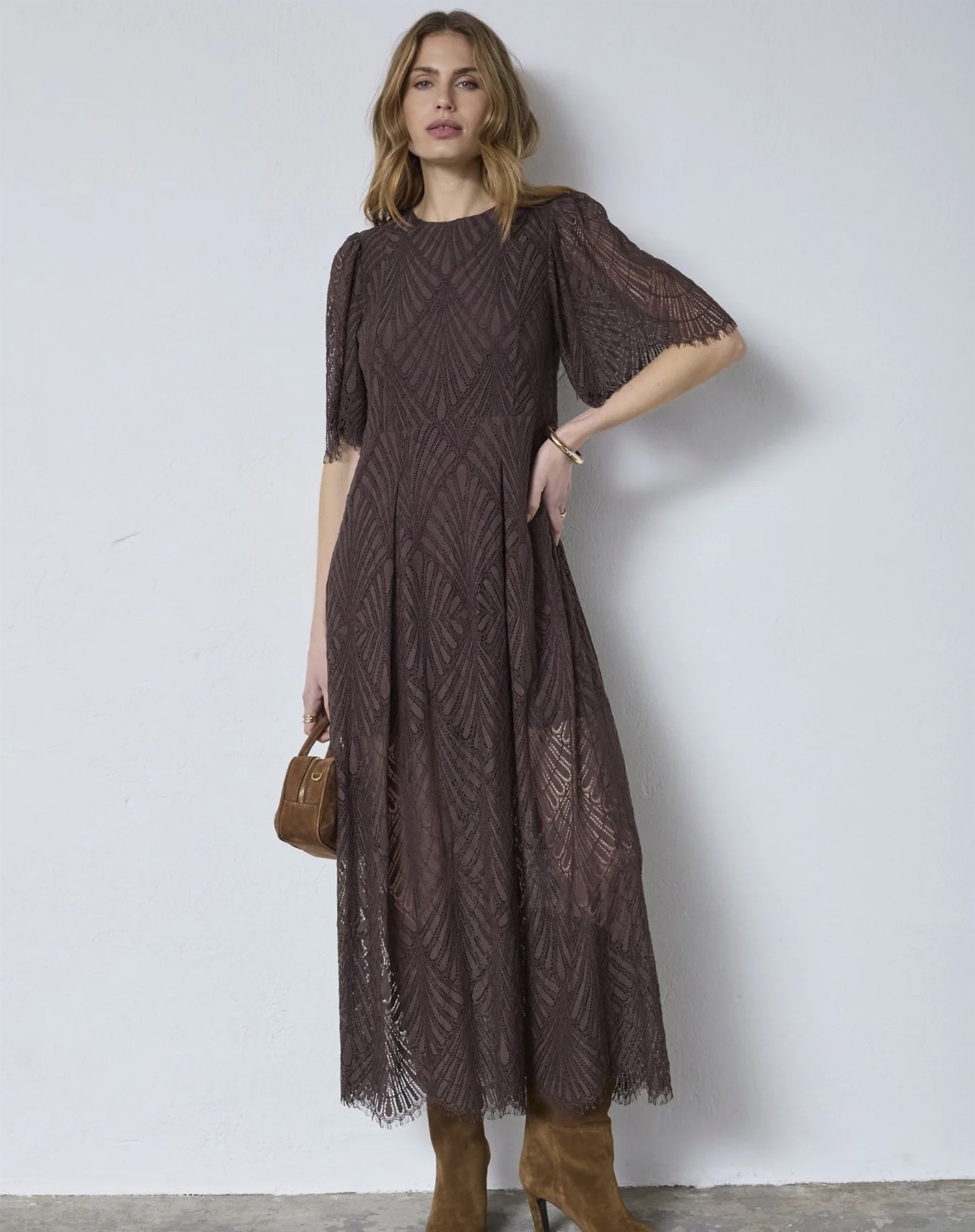 Warum wirst du dieses Kleid lieben? Der dunkelbraune Farbton ist zeitlos und vielseitig, wodurch es sich leicht in deine Garderobe integrieren lässt. Die feine Spitze setzt ein luxuriöses Detail, das nicht unbemerkt bleibt. Außerdem sorgt die maxi-lange Form für eine schöne, schlanke Silhouette, die den meisten Figuren schmeichelt. Co'Couture ist bekannt für ihr Gespür für Details, und dieses Kleid ist keine Ausnahme – es strahlt Qualität und Stilbewusstsein aus.