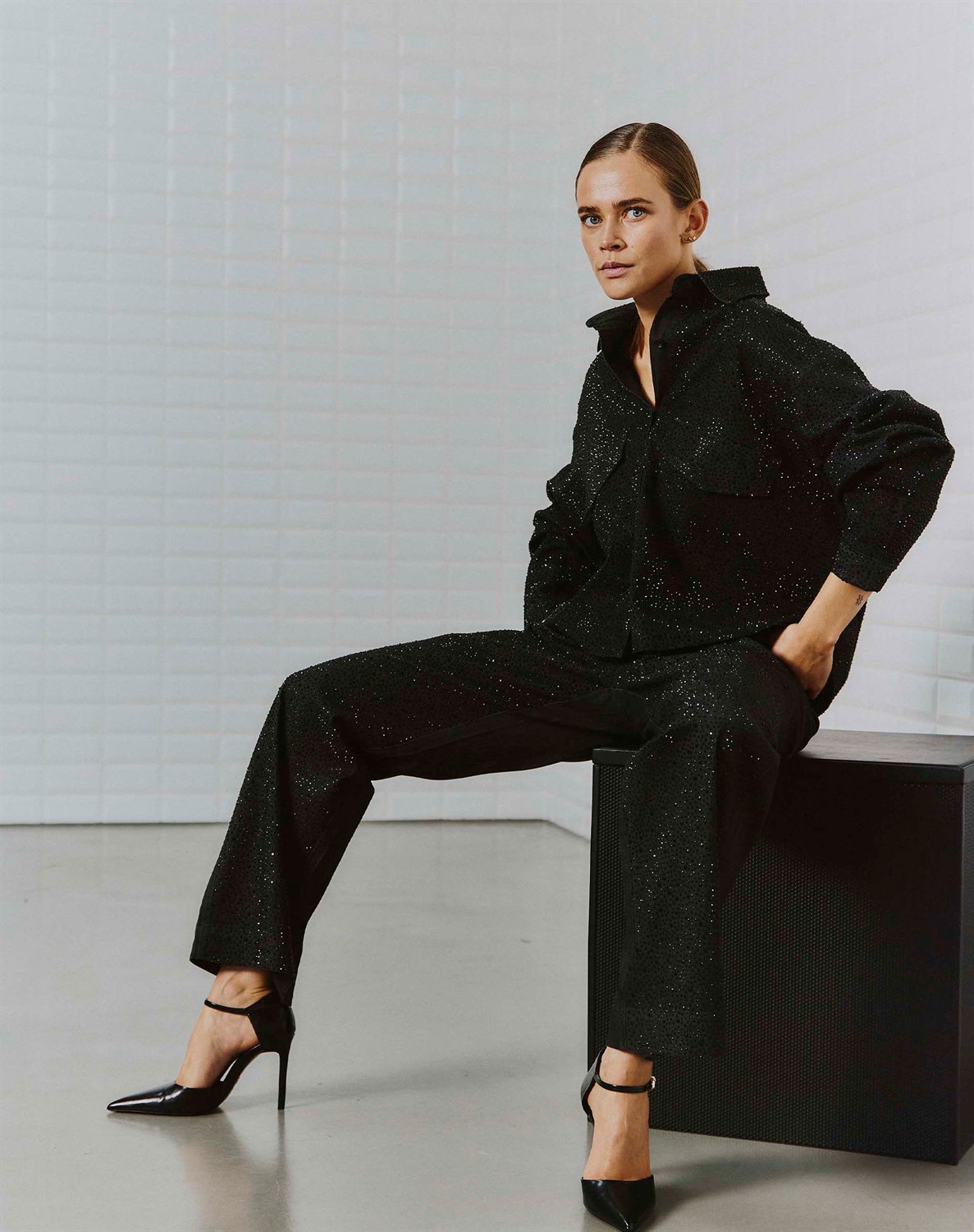 • Klassisches schwarzes Denim mit Steinen.