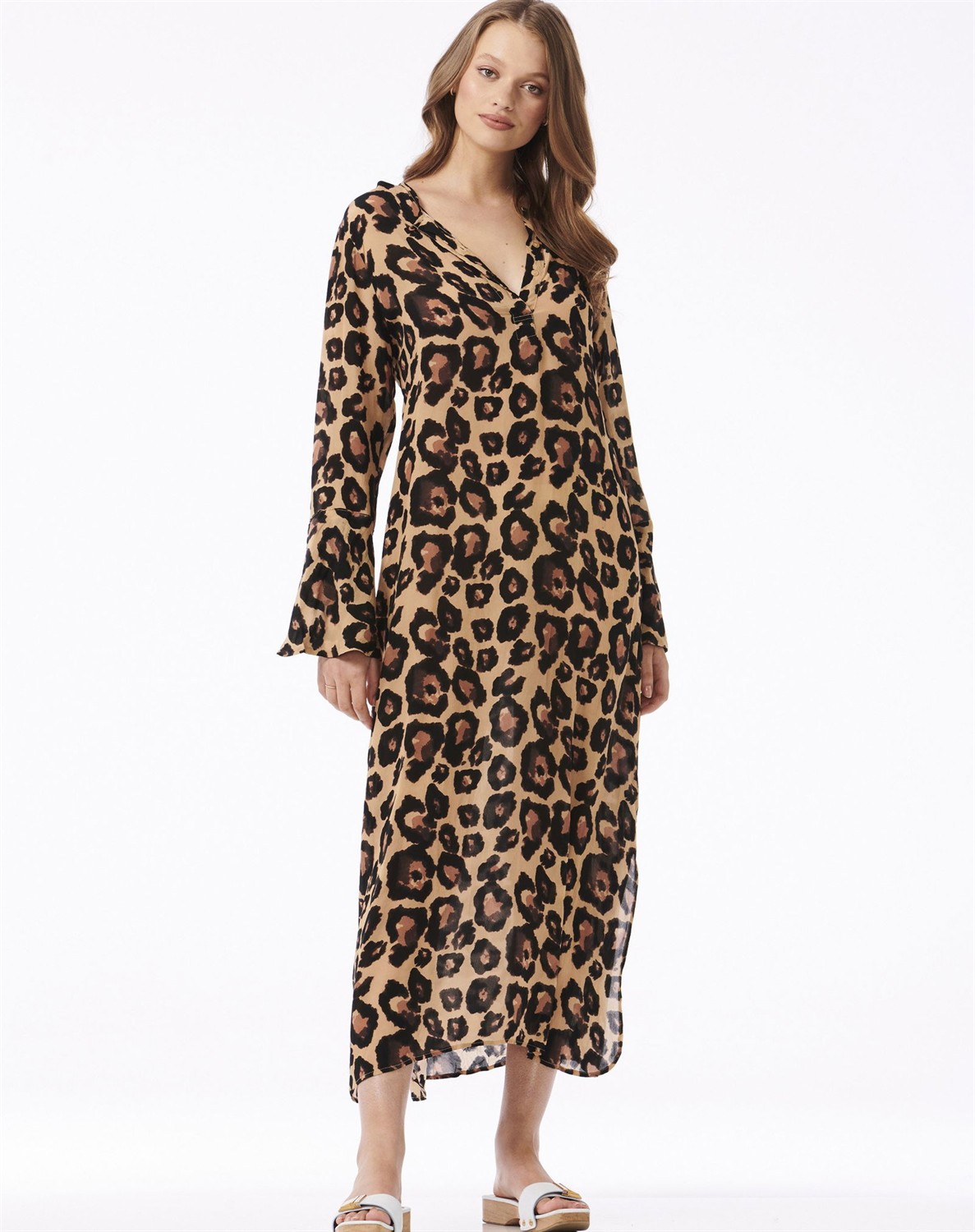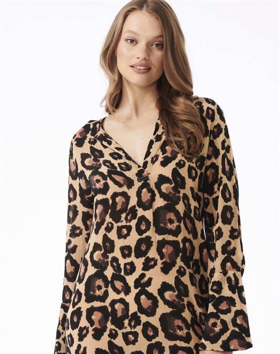 Genie Sahara Kleid - oneseason AustraliaWunderschönes Kleid im feinsten Leopardenmuster von oneseason Australia. Das Genie Sahara Kleid ist aus einer leichten und feinen Qualität gefertigt und hat eine schöne und entspannte Passform, die für einen tollen Look und hohen Tragekomfort sorgt. Das Kleid ist mit langen Ärmeln, einem Knopfverschluss am Halsausschnitt und einer guten Länge designt, die sowohl mit nackten Beinen als auch mit einer Jeans darunter getragen werden kann.