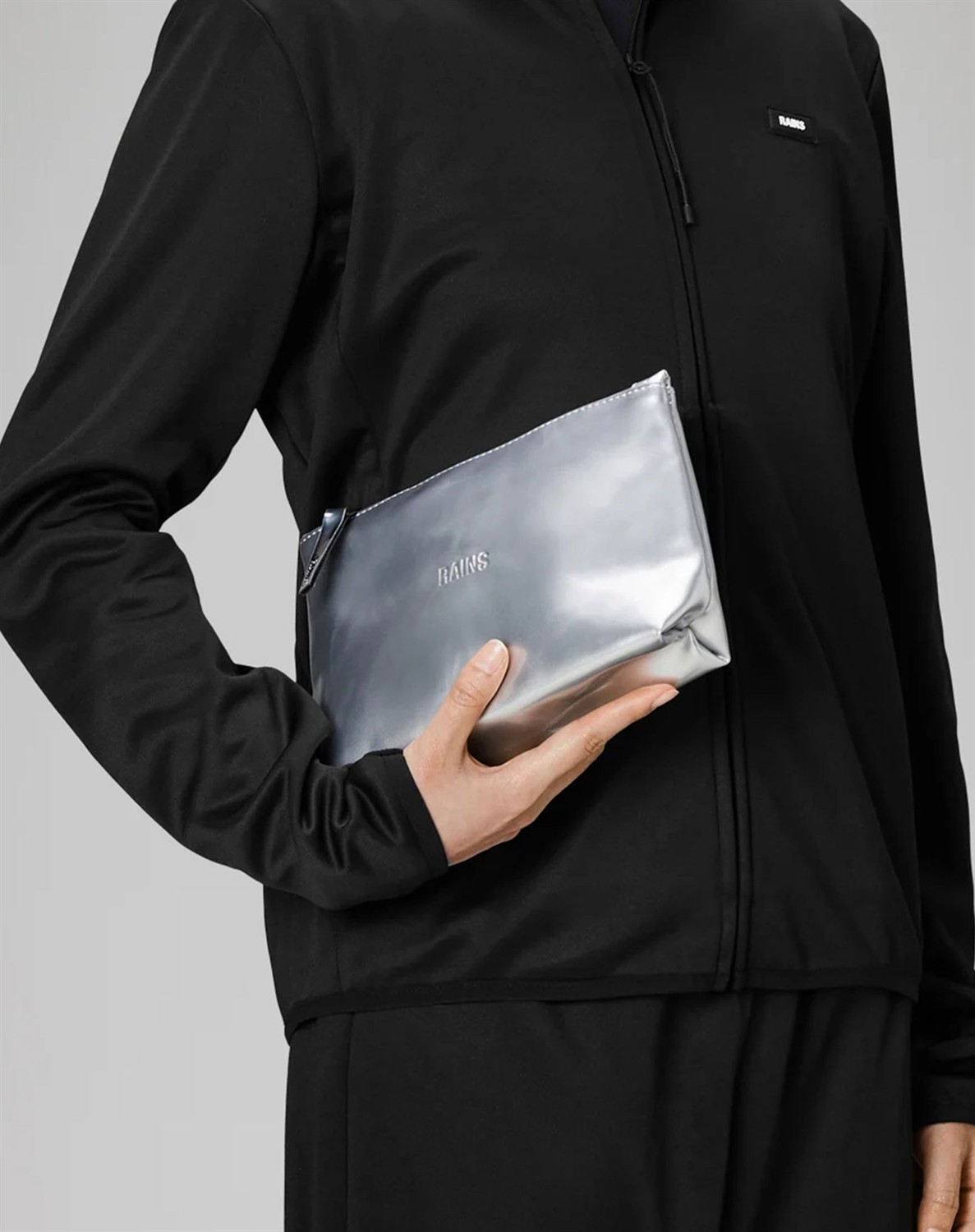 Schicke Kulturtasche von Rains. Die Tasche hat ein minimalistisches Design mit einem Fach, das Platz für kleine Toilettenartikel bietet. Sie hat weiche Kurven unten und eine einfache Naht entlang der Öffnung.
