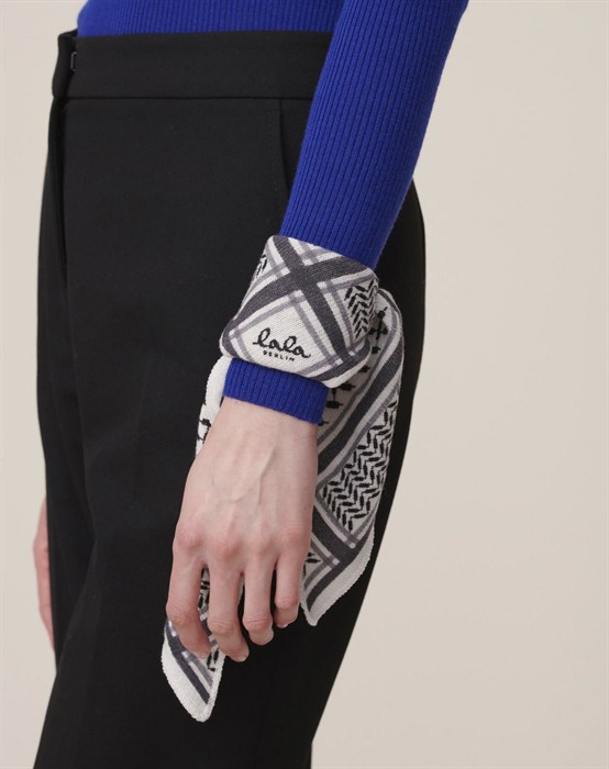 Wunderschöner Schal aus hochwertiger Kaschmirwolle von Lala Berlin. Der Schal ist dreieckig und hat den erkennbaren Kufiya-Print sowie das ikonische Lala Berlin Logo vorne. Die Lala Berlin Schals wurden einer speziellen Wäsche unterzogen, die verhindert, dass die Wolle fusselt oder unansehnlich wird, was dem Schal eine lange Lebensdauer verleiht.
