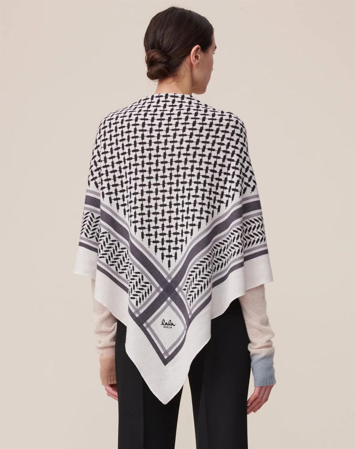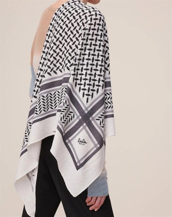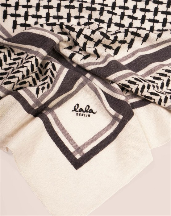 Wunderschönes Tuch in hochwertiger Kaschmirwollqualität von Lala Berlin. Das Tuch ist dreieckig und hat das erkennbare Kufiya-Muster sowie das ikonische Lala Berlin-Logo vorne. Die Lala Berlin Schals haben eine spezielle Wäsche durchlaufen, die verhindert, dass die Wolle fusselt oder unansehnlich wird, was dem Tuch eine lange Lebensdauer verleiht.