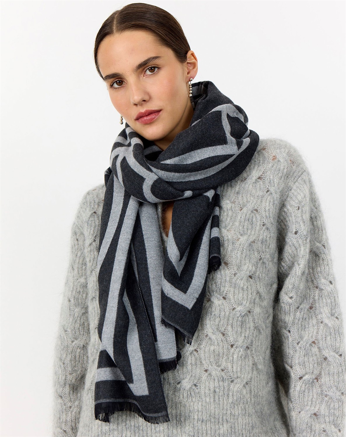 • Der Schal hat ein Print und Fransen