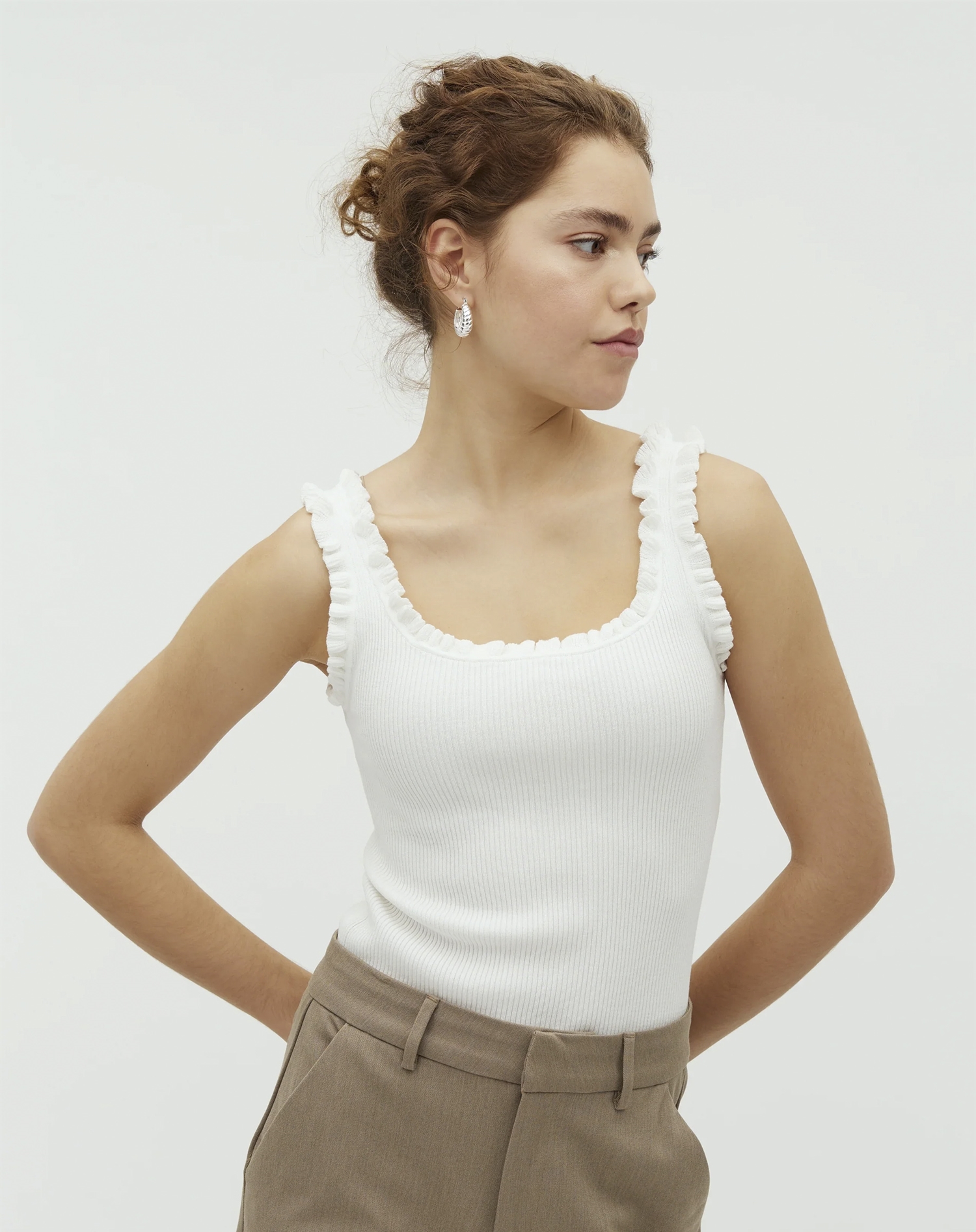 Stell dir vor, du stylst dieses Top mit einer hellen Jeans und einer leichten Strickjacke für einen lässigen, aber stilvollen Wochenend-Look. Es lässt sich auch ganz einfach mit einem Rock kombinieren, um einen raffinierteren Auftritt zu kreieren. Ob du Sneakers oder Sandalen bevorzugst: Das Elinne-M Top passt sich deinem Stil wahrscheinlich mühelos an und macht es dir leicht, zu jedem Anlass chic zu bleiben.