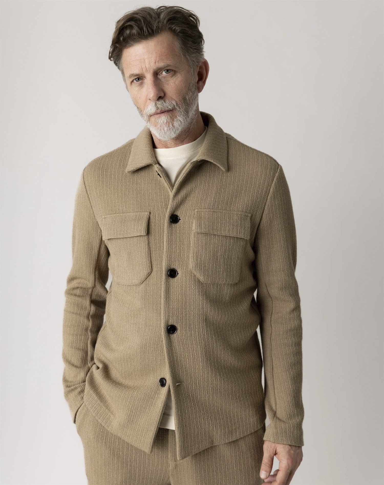 Dieses Overshirt ist ideal für Layering-Looks. Trage es über einem klassischen weißen T-Shirt für einen entspannten Look oder über einem leichten Pullover an kühleren Tagen. Die neutrale Farbe "Dune" lässt sich leicht sowohl mit Jeans als auch mit formelleren Hosen kombinieren und macht es zu einer vielseitigen Wahl für Alltag und Büro.
