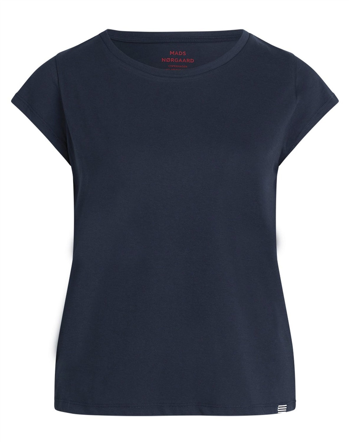 Basis-T-Shirt im klassischen Design und aus hochwertiger Bio-Baumwolle von Mads Nørgaard. Das T-Shirt hat einen Rundhalsausschnitt, kurze Ärmel und eine leichte, lockere Passform, die es angenehm zu tragen macht. Das ikonische gestreifte Mads Nørgaard Logo ist am unteren Saum aufgenäht.