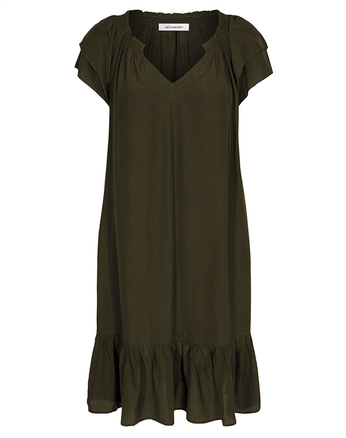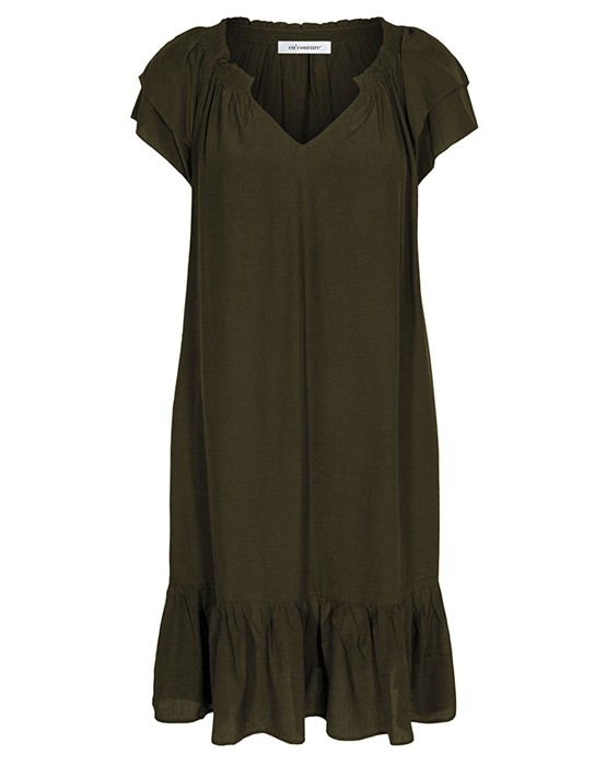 Sunrise Cropped Kleid - Co' CoutureDieses wunderschöne Sunrise Kleid von Co’Couture ist in neuen, herrlichen Farben zurück und natürlich auch in den bekannten. Das Kleid hat feine feminine Details mit Rüschenärmeln, einem breiten Rüschenrand unten sowie einem elastischen Kragen. An den Seiten hat das Kleid versteckte Taschen. Es fällt schwer und elegant und ist knapp unter dem Knie geschnitten.