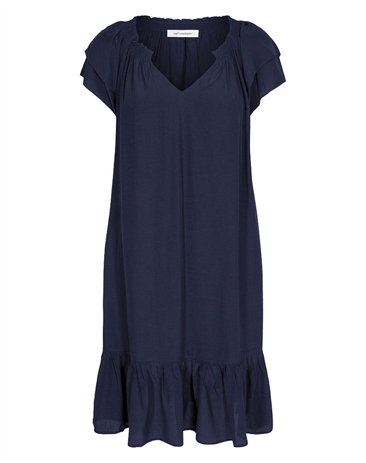 Sunrise Cropped Kleid - Co' CoutureDieses wunderschöne Sunrise Kleid von Co’Couture ist in neuen, herrlichen Farben zurück und natürlich auch in den bekannten. Das Kleid hat feine feminine Details mit Rüschenärmeln, einem breiten Rüschenrand unten sowie einem elastischen Kragen. An den Seiten hat das Kleid versteckte Taschen. Es fällt schwer und elegant und ist knapp unter dem Knie geschnitten.